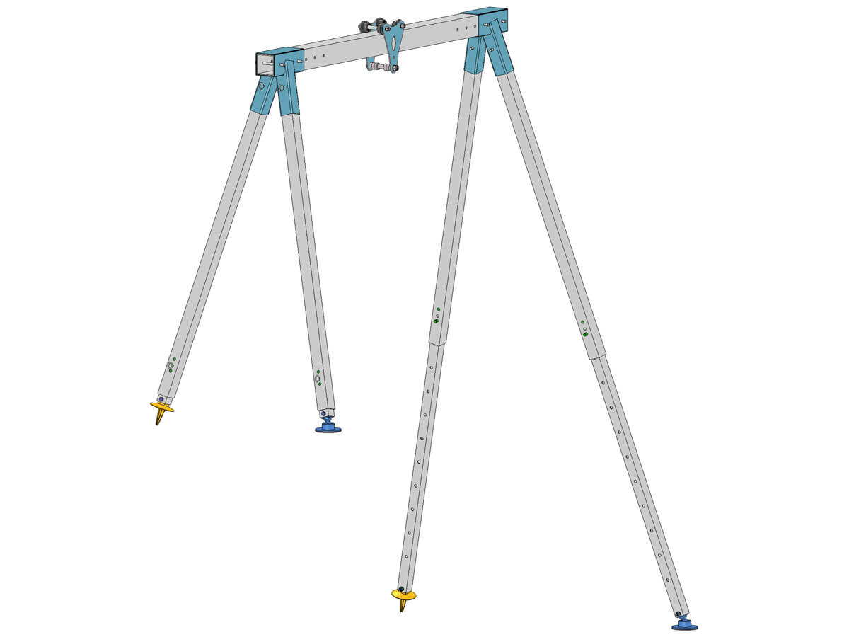 Das Alu-Vierbein ist das Kleinste unserer Krane. Mit seinen überschaubaren Abmessungen und den steckbaren Stützen eignet es sich ideal für die Mitnahme auf Montage. Egal ob auf dem LKW oder im Kombi, das Alu-Vierbein findet immer seinen Platz. Seine Einzelteile sind leicht und handlich. Mit wenigen Handgriffen ist es aufgebaut und voll einsatzbereit. Eine echte Alternative zu einem Dreibaum.