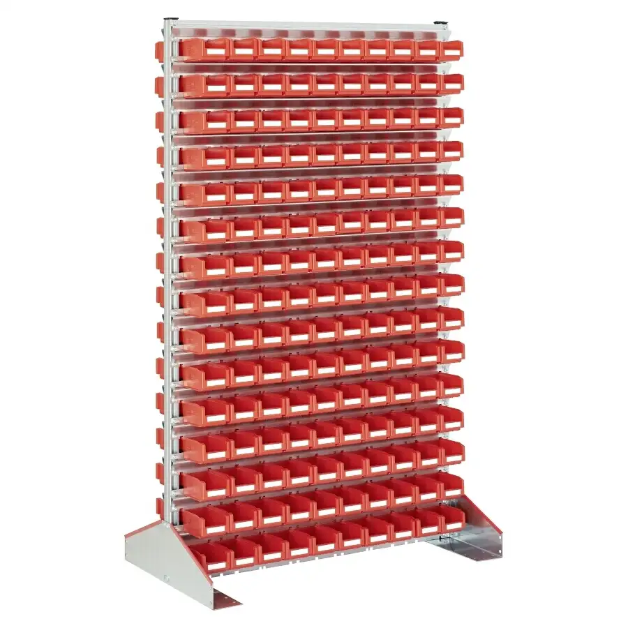 Das zweiseitige BITO Behälterregal können Sie zentral aufstellen und zwei Arbeitsplätze mit Bauteilen zu versorgen. Hierbei sorgen die stabilen Metallfüße für einen sicheren Stand. Ebenfalls lässt sich das System jederzeit individuell erweitern und auch mehrstöckige Bauweisen sind mit den Ständerregalen von BITO problemlos umsetzbar.
