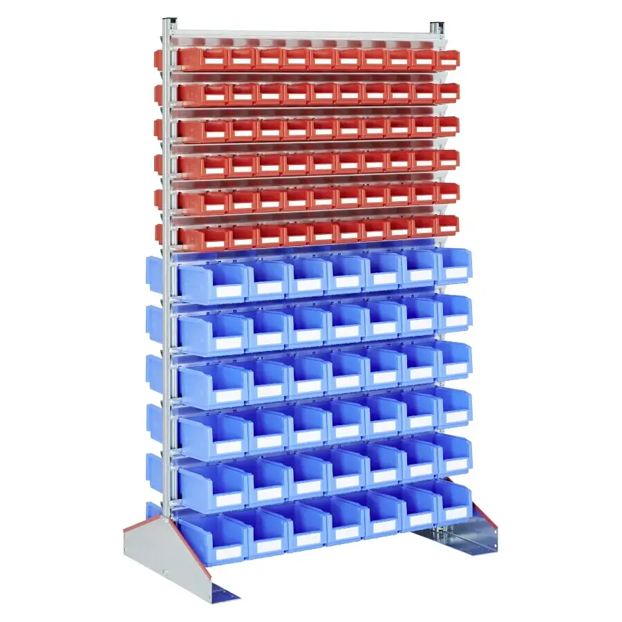 Das zweiseitige BITO Behälterregal können Sie zentral aufstellen und zwei Arbeitsplätze mit Bauteilen zu versorgen. Hierbei sorgen die stabilen Metallfüße für einen sicheren Stand. Ebenfalls lässt sich das System jederzeit individuell erweitern und auch mehrstöckige Bauweisen sind mit den Ständerregalen von BITO problemlos umsetzbar.