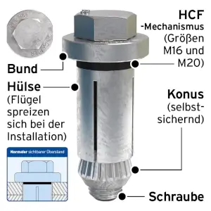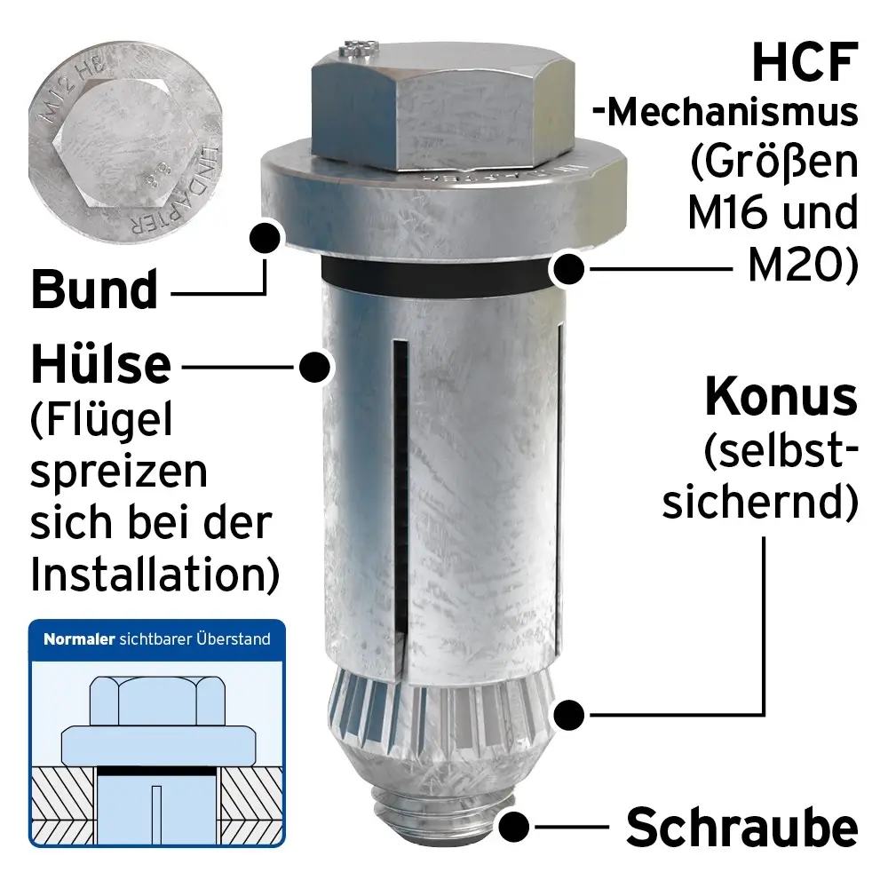 In enger Zusammenarbeit mit Bauingenieuren und Stahlbauunternehmen entwickelte Lindapter den HCF-Mechanismus, um eine höhere Vorspannung in der Verbindung zu erreichen. Das Lindapter-Design HCF (High Clamping Force)führt zu wesentlich höheren Klemmkräften in der Verbindung. Der HCF-Mechanismus besteht aus einer speziellen gummielastischen Scheibe, die bei der Montage zusammengedrückt wird. Sie ermöglicht eine höhere Vorspannkraft bei gleichbleibend großem Hollo-Bolt. Damit sind diese Dübel für größere und schwerere Stahlbaukonstruktionen besonders geeignet.