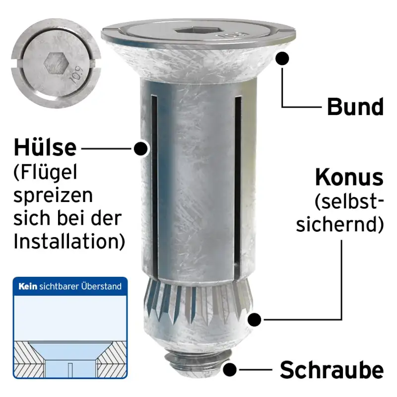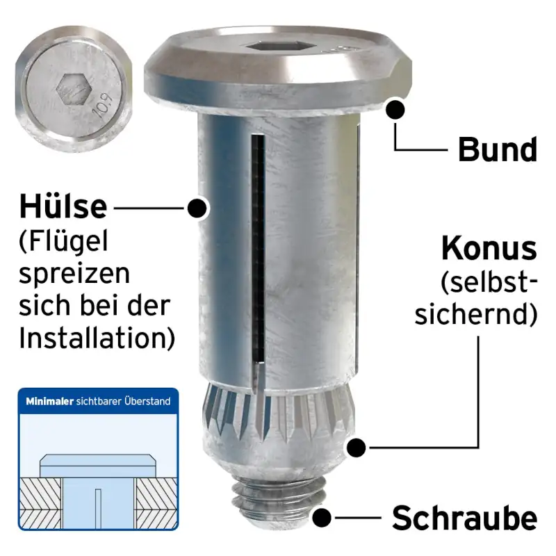 Nach dem Aufbringen des vollen Anziehmoments entsteht über die Vorspannkraft eine Klemmwirkung, die einen sicheren Sitz der Verbindung gewährleistet. Im montierten Zustand sind nur noch der Kopf und der Bund zu sehen.