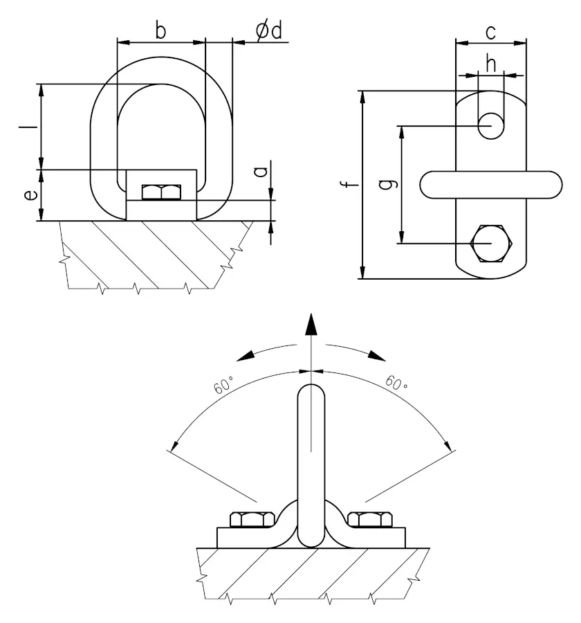 Es ist wichtig zu beachten, dass der Lastbügel frei beweglich sein muss und sich nicht an Kanten oder am Anschlagpunkt selbst abstützen darf. Der Arbeitsbereich bzw. belastbare Schwenkbereich des Anschlagpunktes beträgt 120 Grad, was eine flexible Handhabung und verschiedene Anschlagwinkel ermöglicht.