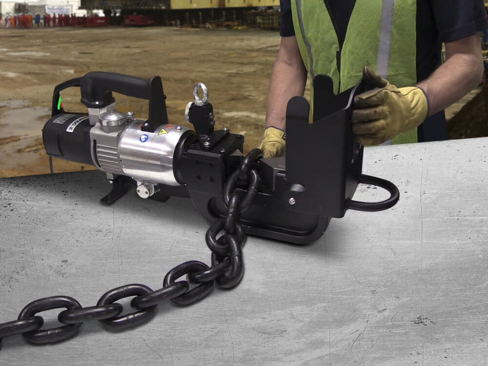 Der Kettenschneider realisiert ein schnelles Durchtrennen von schweren Kettengliedern mit minimalem Kraftaufwand. Die hochbelastbaren Messer überragen Winkelschleifer oder Sägeblätter. Zudem minimiert der Schneidvorgang die Funkengefahr im Vergleich zu Schweiß-, Schleif- und Sägeverfahren erheblich. Schneidgeräte erzeugen kaum Vibrationen und verhindern so HAVS (Hand-Arm-Vibrationssyndrom). Der doppeltwirkende Zylinder verbessert die Kontrolle und reduziert das Verklemmen beim wieder Einfahren.