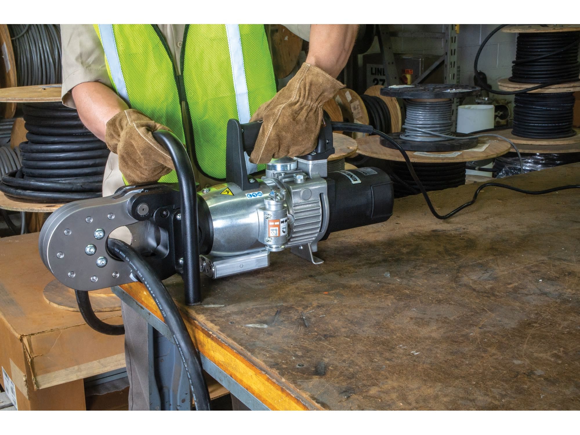 Die hydraulische Kraft wird von einem Wechselstrom-Elektromotor und einer internen Hydraulikpumpe erzeugt. Der Ölfluss gelangt durch die Pumpe in den Hydraulikzylinder, wodurch der Zylinderkolben aus- und wieder eingefahren und das Messer bewegt wird. Ein Hydrauliktank mit eingebauter Gummimembran versorgt die Pumpe konstant mit Öl, und zwar unabhängig von der Werkzeugausrichtung oder der Kolbenausdehnung.