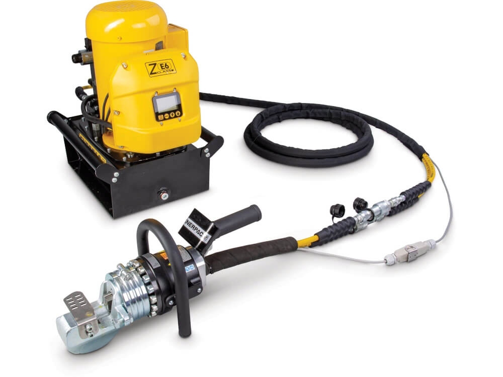Das Steuerventil der Pumpe wird über ein hydraulisches Hochdruck-Zwillingsschlauchsystem an das Schneidgerät angeschlossen. Die Schläuche sind Bestandteil eines Schlauchsystems, zu dem auch ein Netzkabel für die Steuerungen des Schneidgeräts gehört. Dieses Schlauchsystem ist nicht im Lieferumfang des Schneidgeräts enthalten und muss separat erworben werden. Um den Anschluss zu erleichtern, verfügen die Schläuche, das Schneidgerät und das Steuerventil der Pumpe über Schnelltrennkupplungen.