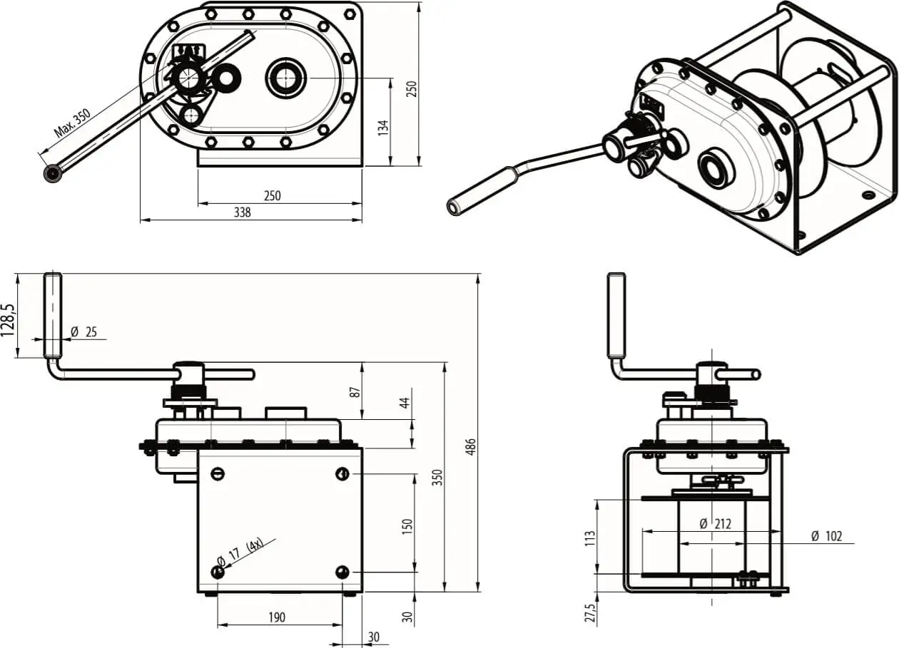 Es handelt sich bei den Winden um Trommelwinden mit einem Stirnradantrieb. Die Last wird in jeder Lage von einer eingebauten Lastdruckbremse gehalten. Das Gehäuse aus Edelstahl eignet sich zur Montage an Wänden, Masten und Ähnlichem. Je nach Bedarf lässt sich die Kurbel in der Länge verstellen.