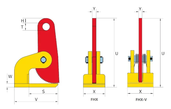 Die horizontalen Schwerlastklemmen FHX und FHX-V von Terrier sind für das horizontale Heben von nicht-biegsamen Platten und Bauteilen ausgelegt und werden immer paarweise (oder in mehreren Paaren) eingesetzt. Sie decken je nach Ausführung einen Greifbereich von 0 - 60 mm sowie Tragfähigkeiten bis 25000 kg pro Paar ab und sind über die Grundmaße (V, S, W, T, H, X, U, Y) und das jeweilige Gewicht klar spezifizierbar. Die Variante FHX-V besitzt zusätzlich eine Torsionsfeder, wodurch das Ansetzen und Positionieren im Handling besonders komfortabel ist.