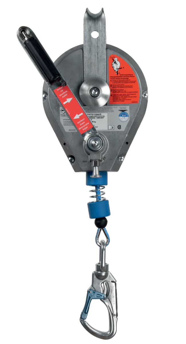 Ikar Höhensicherungsgeräte HRA arbeiten ausgesprochen verlässlich. Das Seil der Höhensicherungsgeräte mit Rettungshub (HRA) zieht automatisch ein, solange die Rettungshubfunktion nicht aktiviert ist. Es ist immer leicht auf Zug. Die Fangvorrichtung im Innern ist aktiv und wacht über die Auszugsgeschwindigkeit des Seils. Kommt es zum Sturz fällt die Bremse ein und stoppt den Stürzenden schon zu Beginn der Fallbewegung. Zur Montage des Höhensicherungsgerätes ist ein Adapter von nöten.