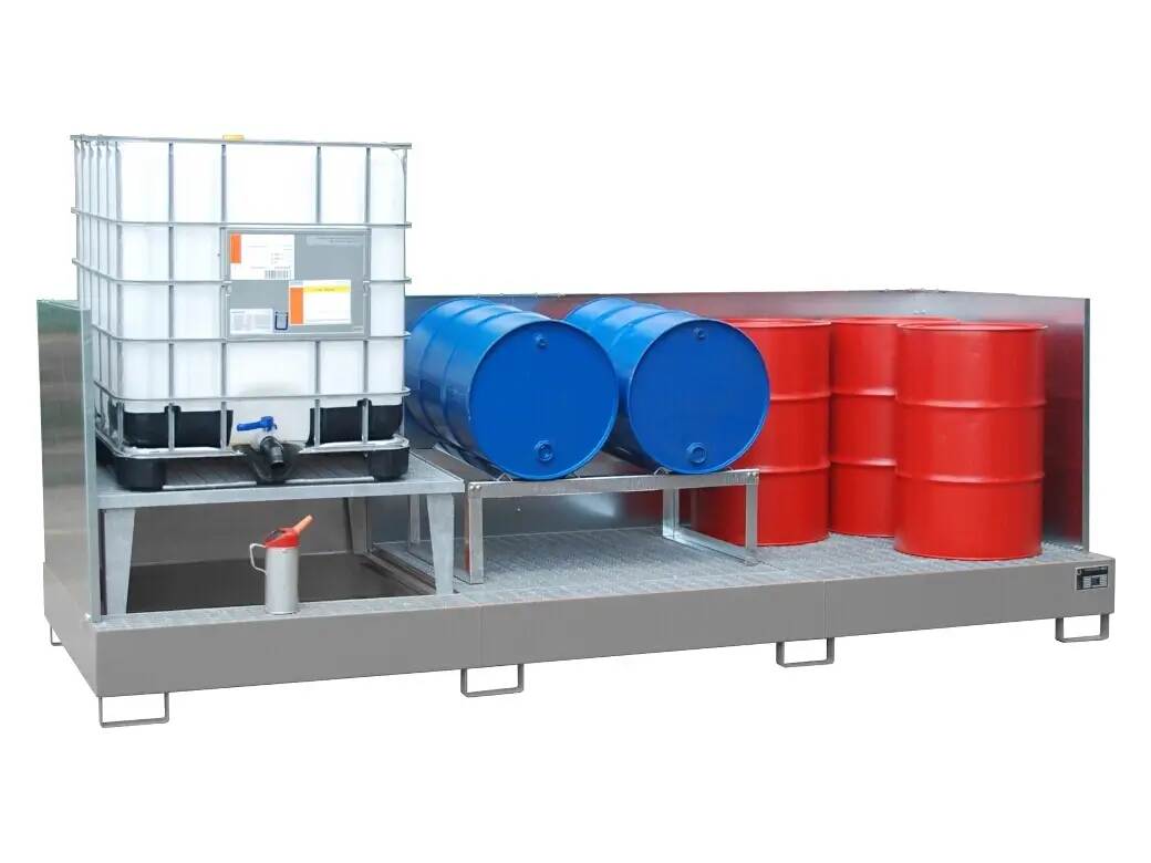 Lagerung von max. 3 Containers (IBC) a 1000 Liter, auch mit 200-/60-l-Fässern und Kleingebinden kombinierbar