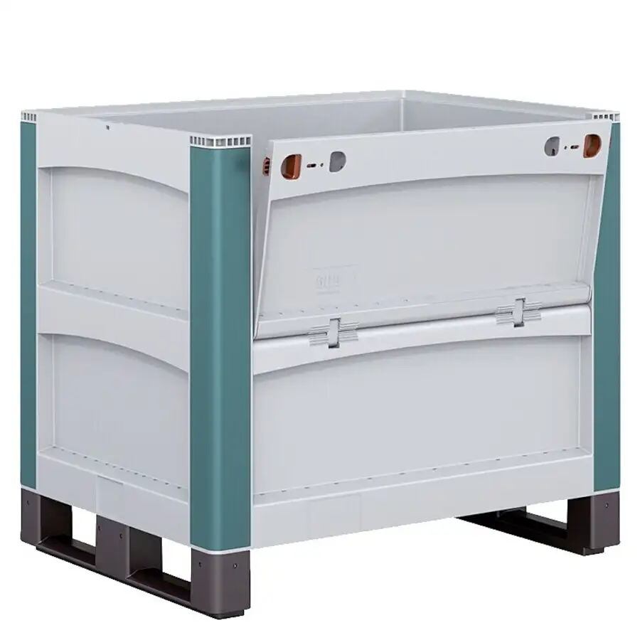 Die Schwerlastbehälter SL-LSK mit längsseitiger Entnahmeklappe sind für besonders hohe Lasten konzipiert. Die Behälter sind aus Kunststoff und damit wesentlich leichter als vergleichbare Gitterboxen oder Stahlbehälter.