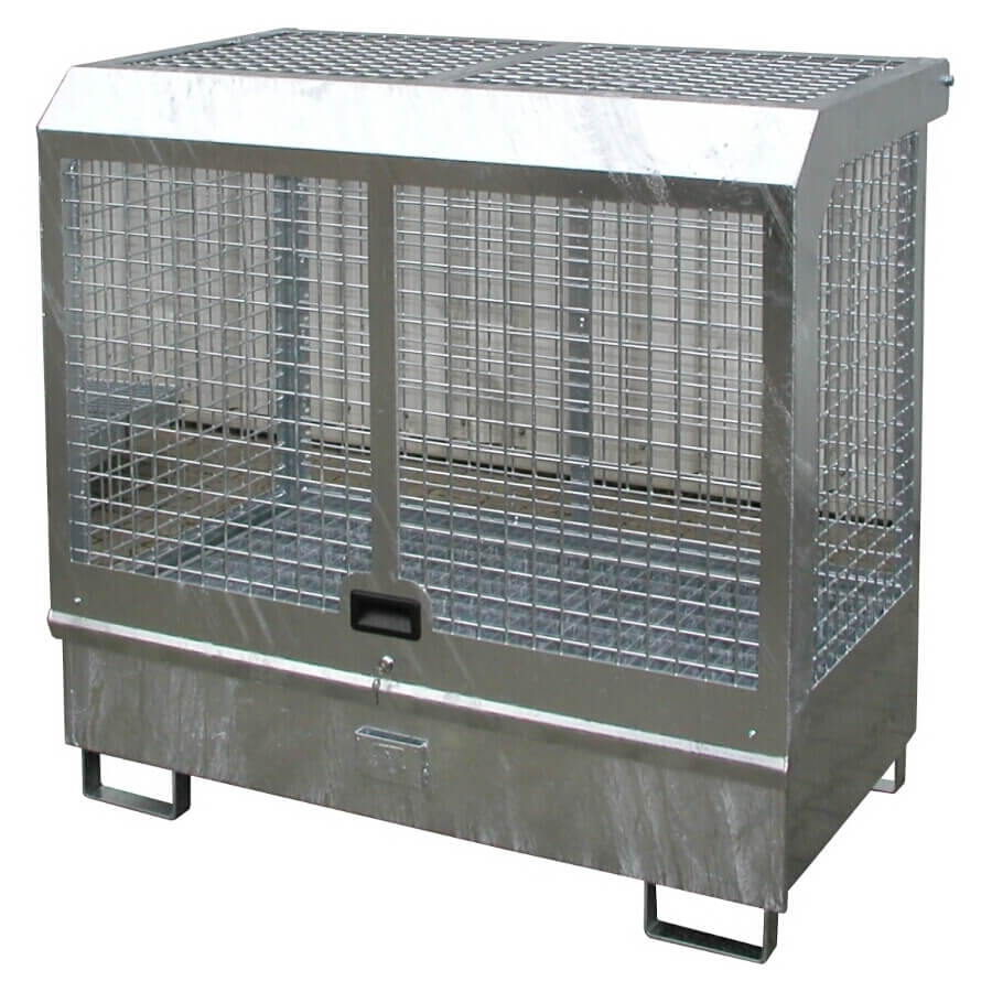 Das Gefahrstoff-Depot GD-C hat Gitterwände und Haube (rot) für natürlichen Luftwechsel. Sie ist mit einem Zylinderschloss abschließbar.