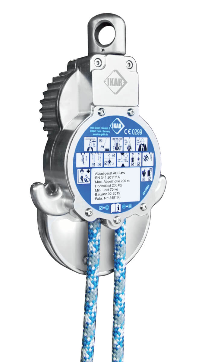 Das Abseilgerät ABS 4aW ist somit das ideale Hilfsmittel für die aktive Eigenrettung von 2 Personen oder für Evakuierungsmaßnahmen mehrerer Personen. Während das eine Seilende mit der sich abseilenden Person nach unten gleitet, wird das andere Ende nach oben gezogen. Sobald die Person unten angekommen ist, kann sich eine weitere Person oben in das andere Seilende einhaken und ebenfalls nach unten fahren. Dieses Pendel-Abseilverfahren ermöglicht ein schnelles Evakuieren gleich mehrerer Personen, die sich nacheinander retten können.