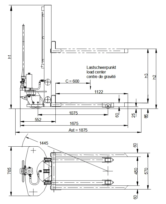| Hydraulikstapler HV 10 | Tragfähigkeit (kg) | Lastschwerpunkt c (mm) | Radstand y (mm) | Lenkrollen (mm) | Lastrollen (mm) | Anzahl Räder/Lastrollen | Höhe Hubgerüst eingefahren h1 (mm) | Feinhub h2 (mm) | Hub h3 (mm) | Höhe Hubgerüst ausgefahren h4 (mm) | Hubhöhe max. h3+h13 (mm) | Gabelhöhe gesenkt h13 (mm) | Gesamtlänge L1 (mm) | Vorbaulänge L2 (mm) | Gesamtbreite B (mm) | Gabeldicke s (mm) | Gabelbreite e (mm) | Bodenfreiheit m1 (mm) | Arbeitsgangbreite bei Pallette Ast (mm) | Wenderadius Wa (mm) | Hub je Hebelbewegung mit/ohne Last (mm) |