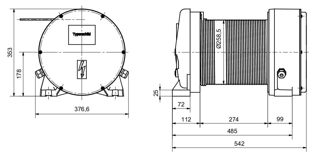 Der in der Seiltrommel angeordnete Einbaubremsmotor ermöglicht eine extrem kompakte Bauform. Die äußerst robuste Ausführung ist wartungsarm und gewährleistet eine lange Lebensdauer. Der Drahtseilabgang ist nach allen Richtungen möglich. Die Elektroseilwinde ist vollkommen gekapselt (Schutzart IP 54) und hierdurch witterungsbeständig.
