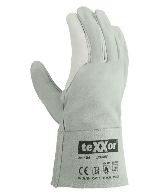 Die Schweisserhandschuhe YASUR aus Rindvoll-/Spaltleder werden im 5-Finger-Design hergestellt. Die Schweißerhandschuhe sind ungefüttert und im Bereich der Innenhand und des Zeigefingers verstärkt. Sie vermitteln ein angenehmes Tragegefühl, sind hitzebeständig, robust und widerstandsfähig. Die Schweißerhandschuhe ermöglichen eine gute Bewegungsfreiheit und einen guten Griff. Die Handschuhe sind einsetzbar für grobe Arbeiten mit mittleren Risiken und hohen Anforderungen an die Abrieb- und Reißfestigkeit sowie für Umgang mit heißen Werkstücken (Kontaktwärme bis max. 100°/15 Sek.). Die Verstärkung an der Innenhand und dem Zeigefinger bieten einen guten Schutz und machen die Handschuhe robust und langlebig.