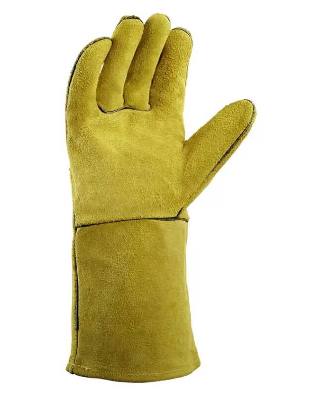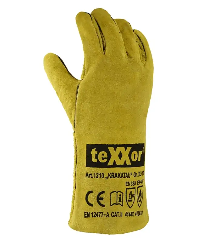 Die Schweisserhandschuhe KRAKATAU aus Rindspaltleder mit gekederten Nähten, werden im 5-Finger-Design hergestellt. Die Lederqualitäten werden für diese hochwertigen Handschuhe speziell ausgesucht. Die Schweißerhandschuhe sind komplett gefüttert und bieten mit ihrer extra langen Stulpe einen guten Pulsschutz. Durch die weiche Fütterung vermitteln sie ein angenehmes Tragegefühl. Sie sind hitzebeständig, widerstandsfähig und verfügen über eine hohe Abrieb- und Reißfestigkeit. Die Schweißerhandschuhe ermöglichen eine gute Bewegungsfreiheit und einen guten Griff. Sie sind einsetzbar für grobe Arbeiten mit mittleren Risiken und sehr hohen Anforderungen an die Abrieb- und Reißfestigkeit sowie für Schweiß- und Entgratungsarbeiten. Das Rindspaltleder ist hochwertig, robust und flexibel.