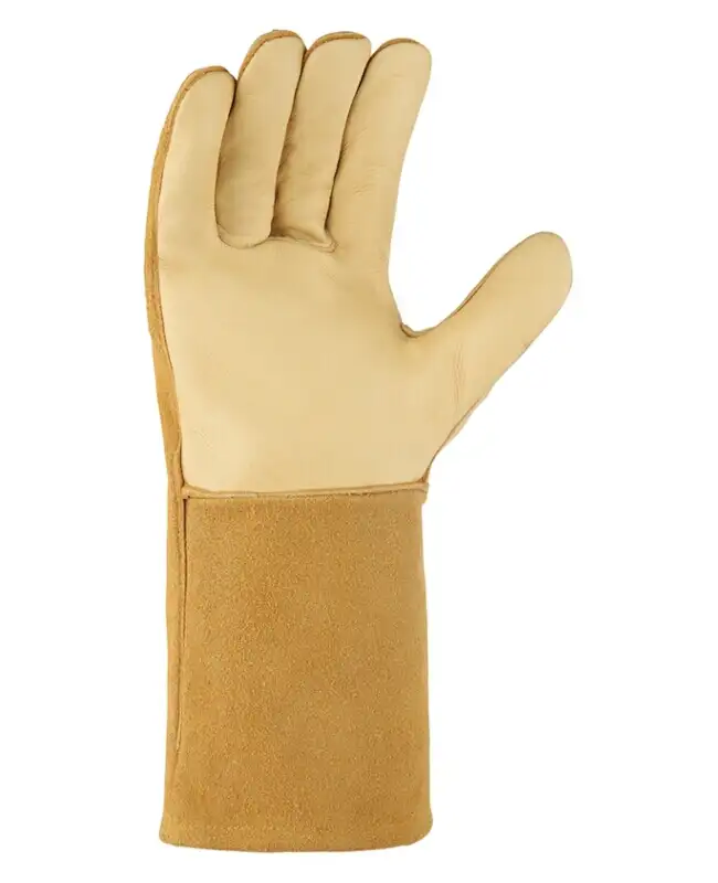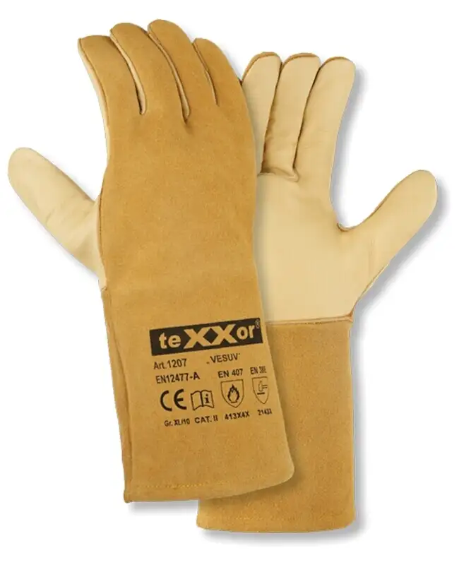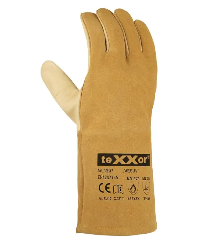 Die Schweisserhandschuhe VESUV aus Rindspaltleder werden im 5-Finger-Design hergestellt. Die Schweißerhandschuhe sind komplett mit Baumwolle gefüttert und bieten mit ihrer extra langen Stulpe einen guten Pulsschutz. Durch die weiche Fütterung vermitteln sie ein angenehmes Tragegefühl. Sie sind hitzebeständig und widerstandsfähig. Die Schweißerhandschuhe ermöglichen eine gute Bewegungsfreiheit und einen guten Griff. Die Handschuhe sind einsetzbar für grobe Arbeiten mit mittleren Risiken und hohen Anforderungen an die Abrieb- und Reißfestigkeit sowie für Schweiß- und Entgratungsarbeiten. Der Mix aus Rindvoll- und Spaltleder macht den Handschuh robust und flexibel.