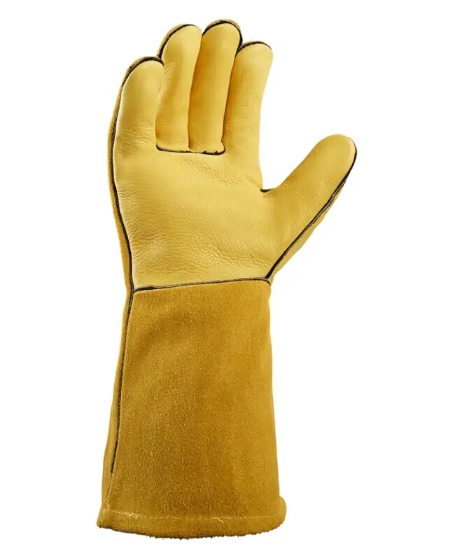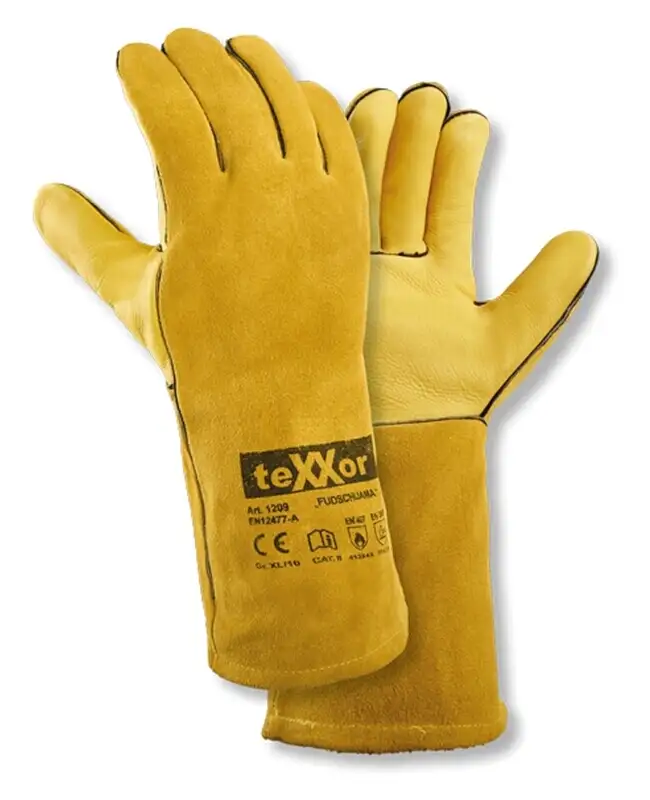 Die Schweisserhandschuhe FUDSCHIJAMA aus Rindvoll/Spaltleder werden im 5-Finger-Design hergestellt. Die Lederqualitäten werden für diese Handschuhe speziell ausgesucht. Die Schweißerhandschuhe sind komplett gefüttert und bieten mit ihrer extra langen Stulpe einen guten Pulsschutz. Die Nähte sind gekedert. Eine Kedernaht gilt als die handwerklich aufwendigste Art der Verzierung. Unter einem Keder versteht man eine Art Wulst, der zur Veredelung oder Nahtverstärkung zwischen die Vorder- und Rückseite genäht wird. Durch die weiche Fütterung vermitteln die Handschuhe ein angenehmes Tragegefühl. Sie sind hitzebeständig, robust und widerstandsfähig. Die Schweißerhandschuhe ermöglichen eine gute Bewegungsfreiheit und einen guten Griff. Die hochwertigen Handschuhe sind einsetzbar für grobe Arbeiten mit mittleren Risiken und hohen Anforderungen an die Abrieb- und Reißfestigkeit sowie für Schweiß- und Entgratungsarbeiten. Die verlängerte Stulpe bieten dem Träger einen hohen Schutz, die Fütterung im kompletten Handschuh sorgt für einen guten Tragekomfort. Der Mix aus Rindvoll- und Spaltleder macht die Handschuhe robust und flexibel.