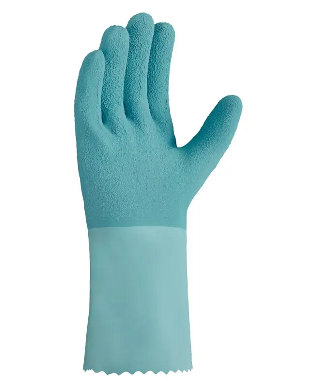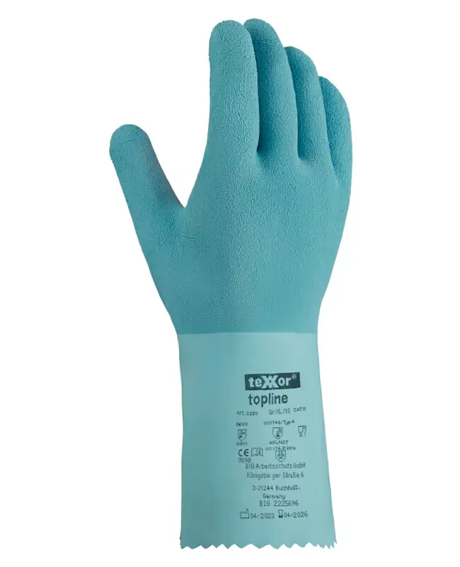Die Chemikalien-Schutzhandschuhe Typ 2250 haben ein hochwertiges Baumwolltrikot-Innenfutter und sind mit Naturlatex beschichtet. Ihre Oberfläche ist geraut um eine noch bessere Griffsicherheit zu gewähren. Die extra lange Ausführung mit einer Länge von ca. 30 cm bietet einen weitreichenden Schutz. Diese Chemikalienschutzhandschuhe verfügen über eine gute Abriebfestigkeit, sind trotzdem flexibel, langlebig, beständig gegen viele Chemikalien und schützen vor Hitze und Kälte. Zudem sind sie Lebensmittelgeeignet gemäß Verordnung (EG) Nr. 1935/2004. Sie bieten eine sehr gute Passform und einen sehr hohen Tragekomfort.