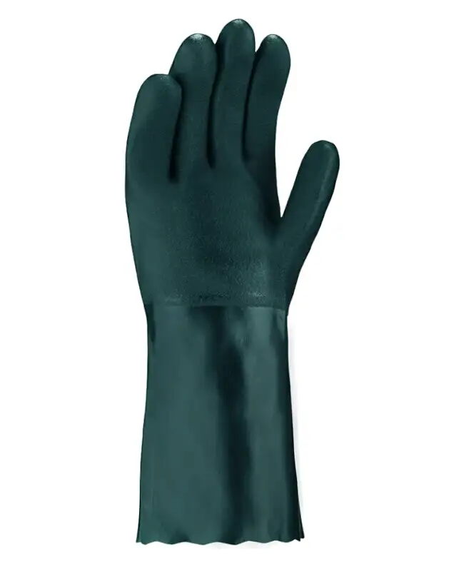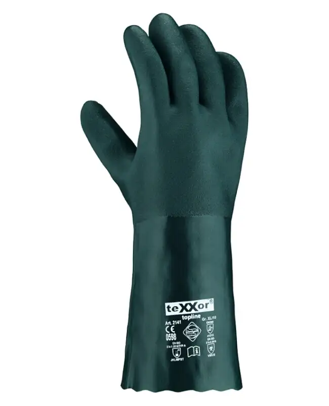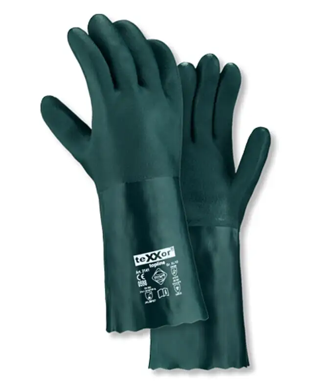 Die hochwertigen »topline«-Chemikalienschutzhandschuhe Typ 2141 aus Polyvinylchlorid haben ein Baumwolltrikot-Innenfutter und sind im Handbereich aufgeraut. Mit ihrer aufgerauten Oberfläche ermöglichen sie einen exzellenten Griff beim Umgang mit nassen und glatten Gegenständen. Sie sind selikonfrei, flexibel und flüssigkeitsbeständig und verfügen über eine hervorragende Beständigkeit gegen verschiedene Chemikalien und Öle. Auf Grund ihrer guten Beständigkeit gegen Abrieb sind sie besonders langlebig. Die Chemikalienschutz-Handschuhe PVC grün sind in unterschiedlichen Längen erhältlich.