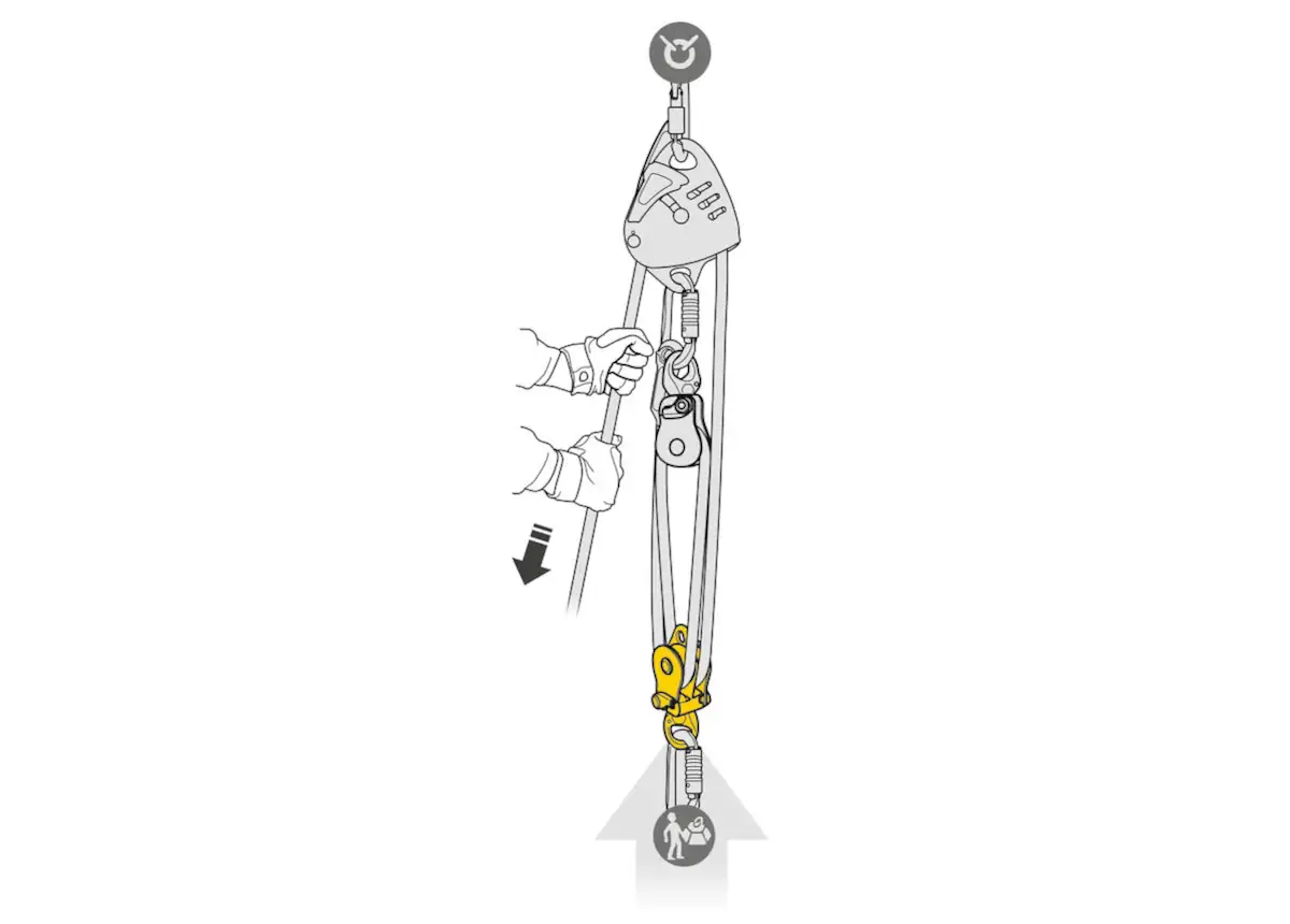 • Er wird zusammen mit einem Abseilgerät zum Einrichten von Umlenksystemen für schwere Lasten oder von Flaschenzugsystemen eingesetzt.