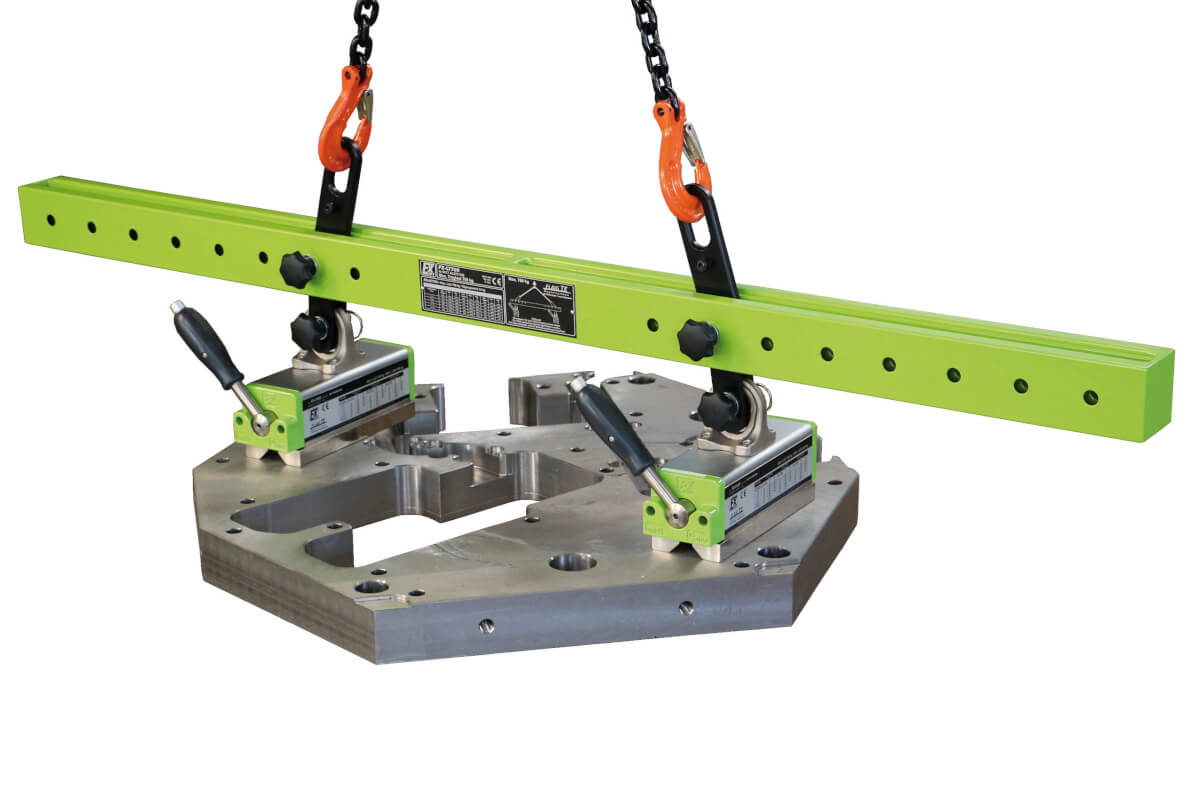 Die Magnettraversen FX-LT von Flaig kann mit Dreh- und Rastvorrichtungen ergänzt werden. Diese ermöglchen ein schnelles Umrichten der Travers von Flach- auf Rundstahlanwendungen