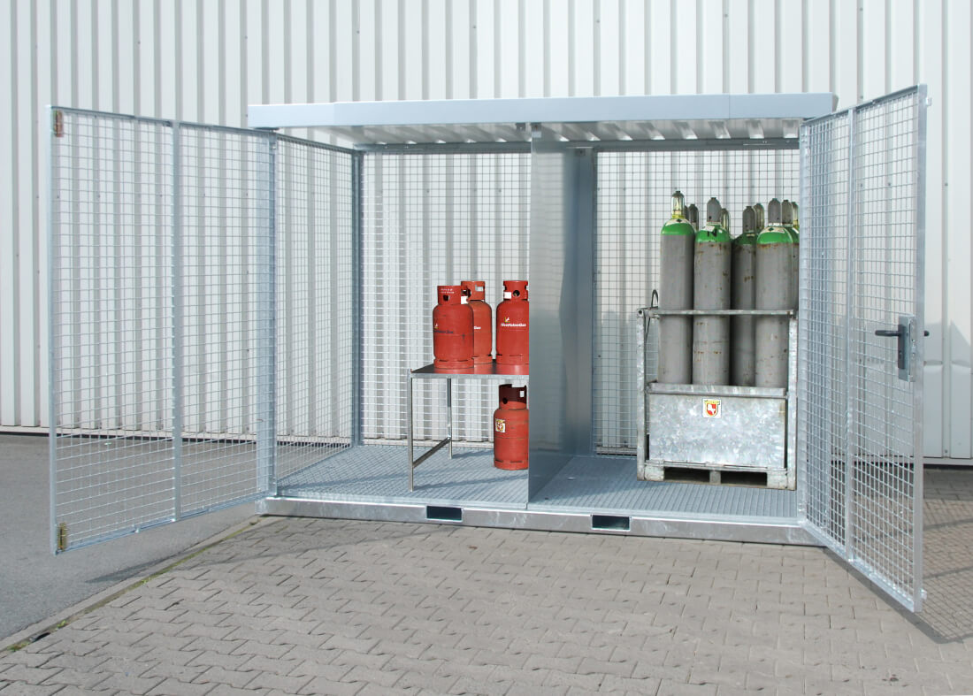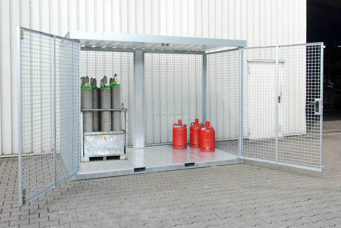 Der Gasflaschen-Container GFC-E eignet sich ideal zum Lagern und Kommissionieren von Gasflaschen. Der Container besteht aus einer stabilen Rahmenkonstruktion, die mit Gitterrost an den Wänden und am Boden ausgelegt ist. Alternativ lässt sich der Boden auch mit Tränenblech ausstatten. Das Dach aus Trapezblech sorgt für Trockenheit und schützt die Flaschen vor Witterungseinflüssen. Die Flügeltür lässt sich mittels Zylinderschloss abschließen und sichert vor unbefugtem Zutritt. Einfahrtaschen im robusten Grundrahmen ermöglichen die Aufnahme mit einem Gabelstapler. Soll der Standort des Containers gewechselt werden, ist dies mittels Stapler schnell erledigt.