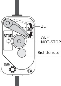 Durch Drücken der NOT-STOP-Taste kann die Fangvorrichtung im Notfall auch von Hand geschlossen werden. Das bietet den Vorteil, eine defekte Winde am hängenden Personenaufnahmemittel auszutauschen.