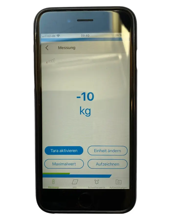 Die App dient zum Abrufen aller Funktionen, wie Tara aktivieren, Einheit ändern, Maximalewerte anzeigen oder das Aufzeichnen der Messergebenisse. Einzig das Ein- und Auschalten muss am Dynafors erfolgen.