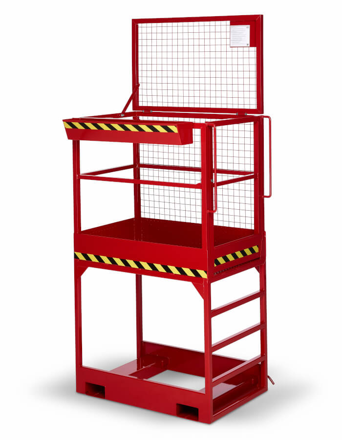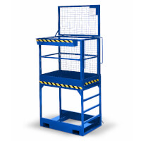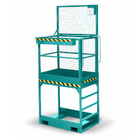 Der Arbeitskorb Typ RAK-high verhilft mit seiner erhöhten Bauform zu größerer Reichweite. Seine 1 m hohe Plattform ist seitlich über Stufen erreichbar. Ein Handlauf erleichtert den Einstieg. Der Arbeitskorb darf nur mit Gabelstaplern eingesetzt werden, die über die erforderliche Tragkraft von 1500 kg, einen Gabelzinkenabstand von 820 mm und eine Gabelzinkenlänge von min. 800 mm verfügen. Der Korb wird über die Steckbolzenverbindung mit den Gabelstaplerzinken verbunden. Ein Abrutschen von den Zinken wird so verhindert. Die Arbeitsplattform ist rutschsicher, die Stahlkonstruktion robust und für maximal 2 Personen ausgelegt. Der Arbeitskorb in extra hoher Bauform dient der Wartung und Instandsetzung hochgelegener Gebäudeteile, Krananlagen oder Deckenbeleuchtungen.