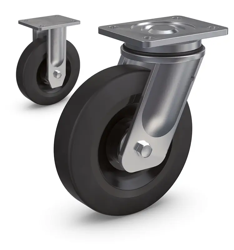 Extrem robust und stabil. Die Bock- und Lenkrollen der Serie 1B und 2B sind extrem belastbar. Ihr Gehäuse besteht aus einer präzisen, hochstabilen Stahl-Schweißkonstruktion. Der Gabelkopf der Lenkrolle 1B ist mit einem hochwertigen Axial-Rillenkugellager ausgerüstet sowie einem Kegelrollenlager zur Zapfenführung. Alle Lagerteile sind staub- und spritzwassergeschützt.