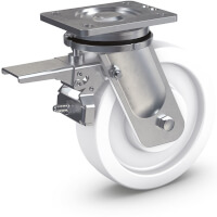 Die Gehäuse aus extra starkem Stahlblech, sind verzinkt-chromatiert und besonders robust ausgelegt. Der Gabelkopf in den Lenkrollen ist auch unter Nennlast leicht drehbar gelagert. Der Zapfen wird mit einem hochwertigen Axial-Rillenkugellager sowie einem Kegelrollenlager geführt. Ein Schmiernippel am Axial-Rillenkugellager dient der Wartung. Die in den Kugellagern verbauten Lagerschalen sind aus gehärtetem Stahl.