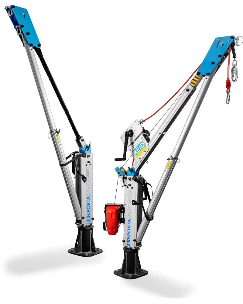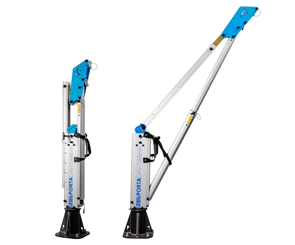Die Windenversion PDQW des Porta-Davit Quantums ist auch in zwei Größen erhältlich und hat eine starre hintere Verstrebung, auf der eine Handseilwinde montiert werden kann. Zudem verfügt diese Version über eine Seilrolle am Kopf des Auslegers, über die das Lastseil umgelenkt werden kann. Dieses Modell kann zum Heben von Gütern oder als Teil einer persönlichen Schutzausrüstung für einen Benutzer verwendet werden. Der Quantum PDQW kann mit seinen 23,5 kg Eigengewicht 600 kg an Material und 300 kg eine Person mit einer Gesamtlast von 300 kg heben. Zusätzlich kann an der Säule eine komplette Rettungseinrichtung montiert werden, sowie eine zusätzliche Seilrolle zum Führen des Seils. Reid bietet eine Reihe von Halterungen an, die auf der Säule oder der Verstrebung angebracht werden können. Sie dienen zur Adaption von Winden oder Höhensicherungsgeräten. So lässt sich eine Kombination aus Hebezeug und Fangvorrichtung installieren. Ideal, um in beengte Räume ein- oder auszusteigen. Alternativ lassen sich auch Elektrokettenzüge oder Durchlaufwinden am Kopf des Davits einhängen, um so das volle Leistungsspektrum nutzen zu können. Der PDQW ist international zertifiziert, um den strengen Sicherheitsanforderungen zu genügen.