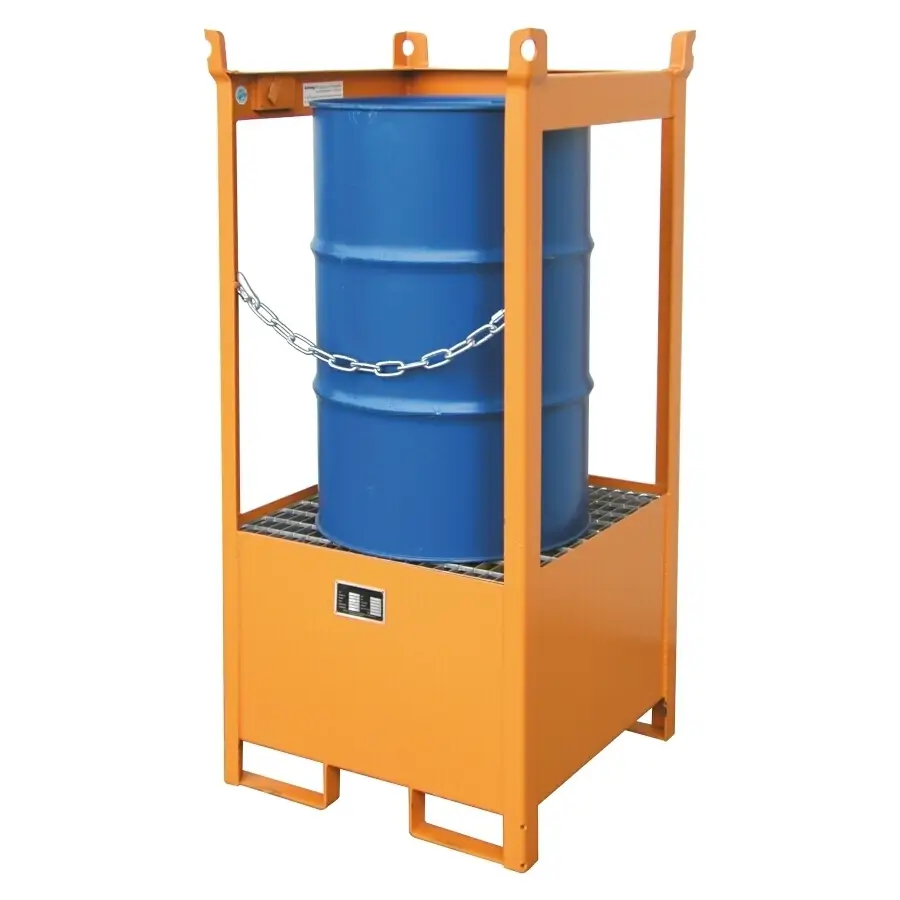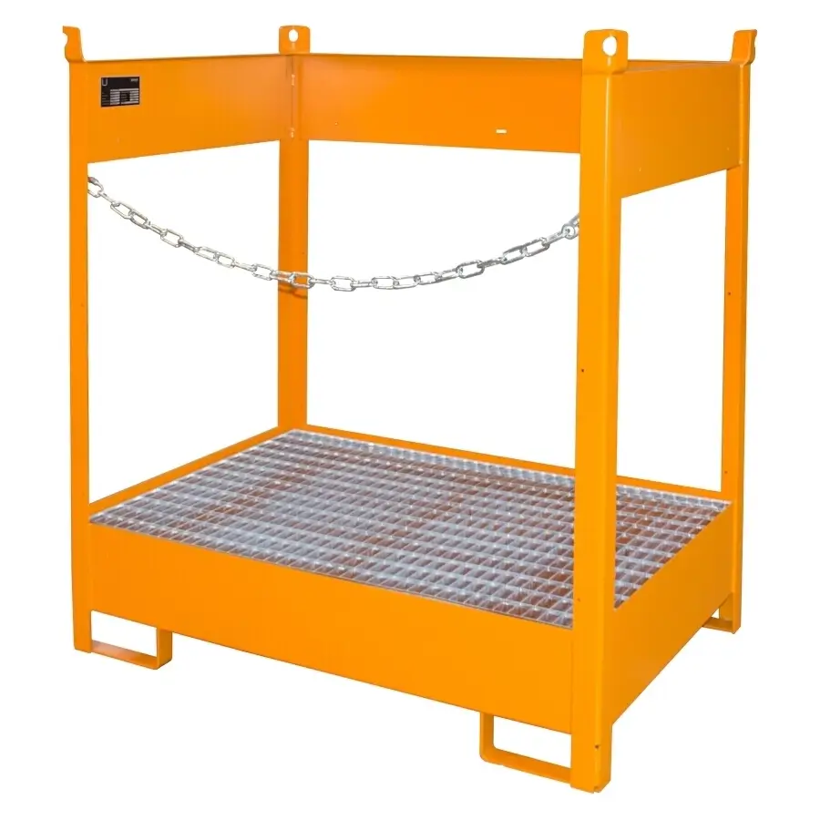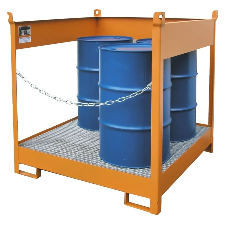 Die Fass-Stapelpaletten FSP eignen sich ideal zu Lagerung von Fässern bis zu einer Größe von 200 Litern. Mit ihrer geschweißten Auffangwanne erfüllen sie alle umwelttechnischen Sicherheitsanforderungen. Das Handling wird durch integrierte Kranösen und Einfahrlaschen für Gabelstaplerzinken erleichtert. Selbst ein Transport mittels Gabelhubwagen wird durch eine Unterfahrhöhe von 100 mm ermöglicht.