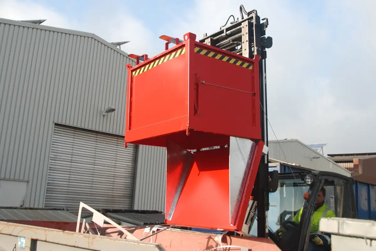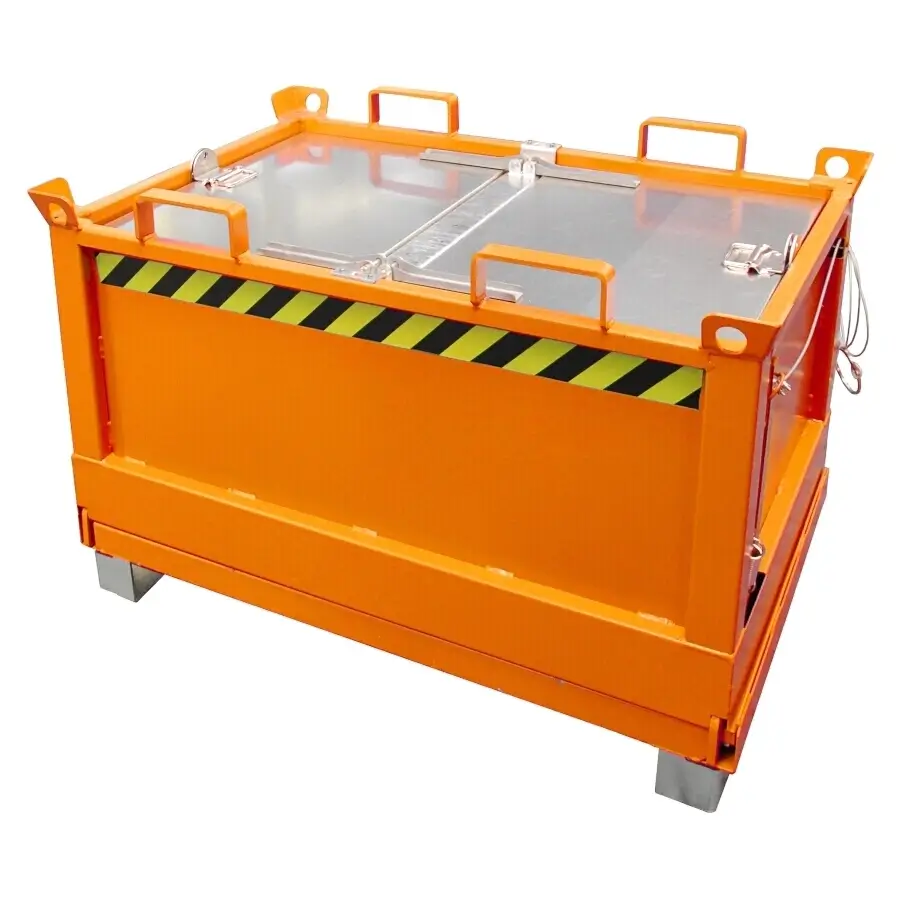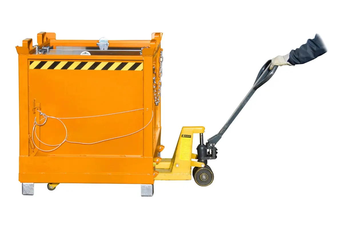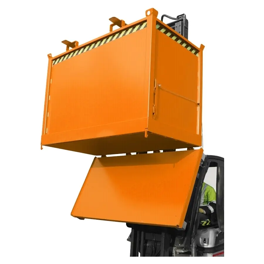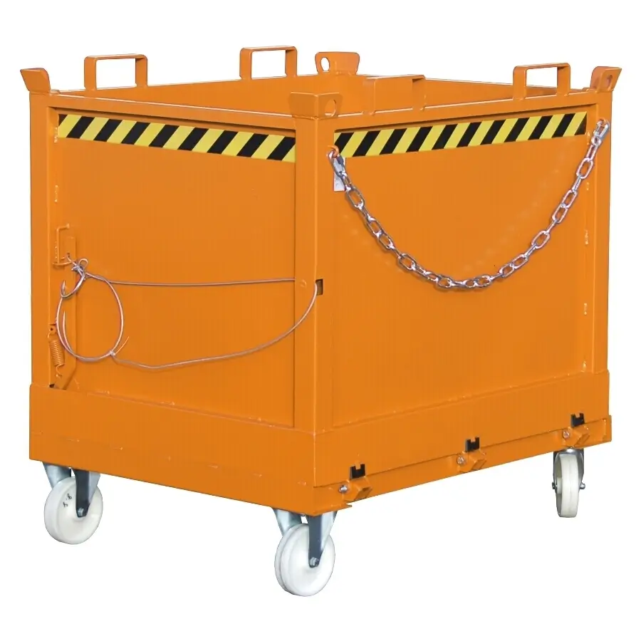 Klappbodenbehälter FB eignen sich ideal zum Sammeln, Lagern und Umfüllen von Wertstoffen wie Metall, Holz und Bauschutt. Die robusten Behälter verfügen über glatte Innenwände womit das Entleeren rückstandslos möglich ist. Die Entriegelung der Bodenklappe lässt sich bequem per Seilzug vom Staplersitz aus betätigen. Eine Gummifederung dämpft das ruckartige Herunterschlagen der Bodenklappe beim Entleerungsvorgang. Das Schließen der Bodenklappe erfolgt beim Aufsetzen selbsttätig. Das unbeabsichtigte Abrutschen und Öffnen der Bodenklappe wird durch Vorlegen einer Sicherungskette verhindert.