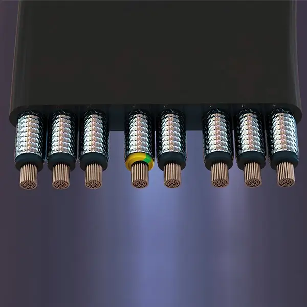 Neoprene Flachleitungen, geschirmt, für den Einsatz als Energie- und Steuerleitungen insbesondere an Hebezeugen, Transportanlagen, Werkzeugmaschinen, Förderbänder, Laufkatzen usw., bei mittleren mechanischen Beanspruchungen und bei betriebsmäßig starken Biegungen in nur einer Ebene; in trockenen, nassen und feuchten Räumen sowie im Freien.