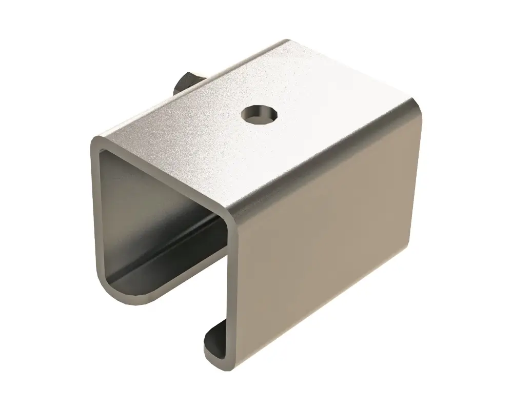 Er ist seitlich mit einer Schraube bestückt, die ein Klemmen und Kontern der C-Schiene ermöglicht.