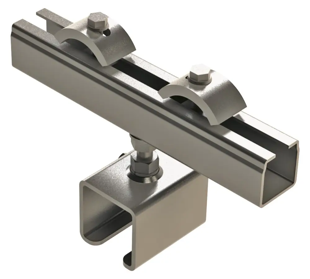 Der Schienenhalter mit Spannarm dient zum Befestigen von C-Schienen an Doppel-T-Trägerprofilen. Hierbei ist der Klemmbereich der Spannpratzen auf dem Spannarm variabel und auf mehrere Trägerflansche einstellbar. Auch ist ein Höhenausgleich über die Gewindestange am Schienenhalter möglich. Mit der seitlichen Konterschraube lässt sich die C-Schiene fixieren.