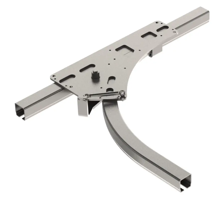 Die Zungenweiche 90° wird vom Fahrwerk geschaltet. Sie wird nach Betätigung automatisch über eine Feder wieder in die Grundposition gestellt. Die Zungenweiche gibt es in einer Links-, Rechts- und Rechts/Links-Ausführung.