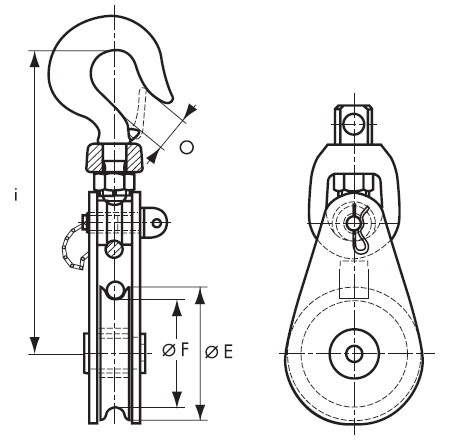 | Typ | Arbeitslast WLL | Seil-Ø min/max | Seilrollen-Ø außen E | Höhe H (ca.) | Eigengewicht | Lagerung |