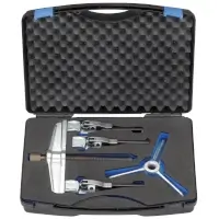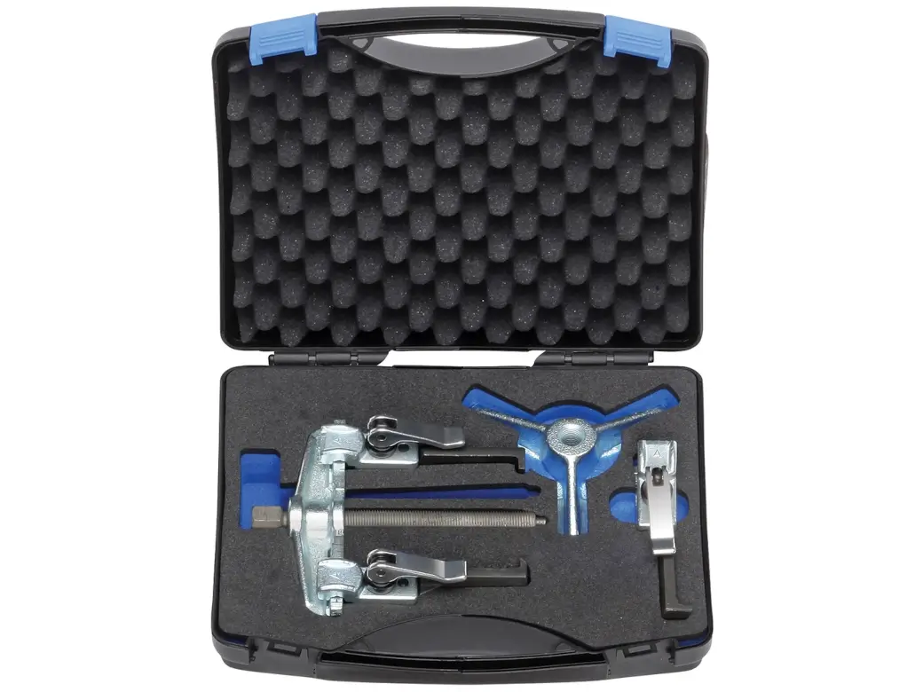 m Kunststoffkoffer befinden sich 2 Spindeln, je eine Traverse 2- und 3-armig und 3 schmale Schnellspann-Abzughaken. Der Inhalt ist optimal für den Einsatz in der Werkstatt oder auf der Baustelle geeignet. Die Verwendung dieser Werkzeuge spart Zeit und Mühe bei der Arbeit.