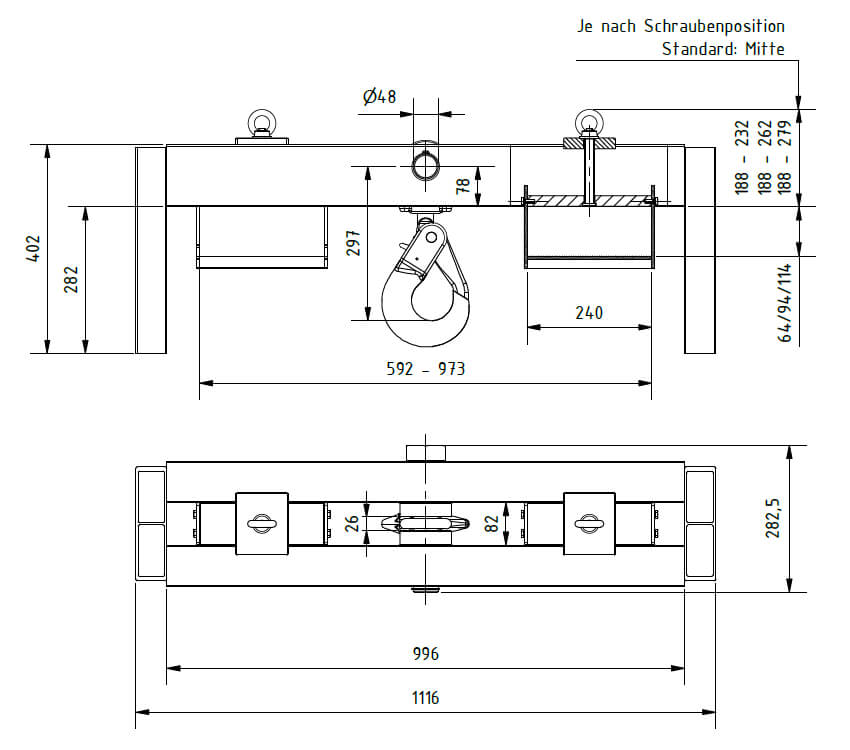 Die Alu-Staplertraverse von Schilling ist extrem leicht und handlich. In die große Aufnahme der Gabelstaplerschuhe passen nahezu alle handelsüblichen Gabelstaplerzinken. Sie lassen sich stufenlos axial verstellen und auf Gabelprofile von max. 240 x 115 mm einstellen.
