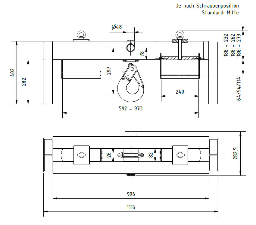Die Alu-Staplertraverse von Schilling ist extrem leicht und handlich. In die große Aufnahme der Gabelstaplerschuhe passen nahezu alle handelsüblichen Gabelstaplerzinken. Sie lassen sich stufenlos axial verstellen und auf Gabelprofile von max. 240 x 115 mm einstellen.