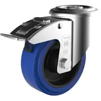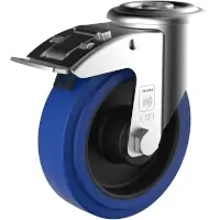 Stahlblechgehäuse mit Rückenlochbefestigung. Gabelkopf mit zweifachem Kugelkranz. Die Grundplatte wird fest mit dem Gabelteil vernietet, dabei achten wir auf geringes Spiel im Gabelkopf bei hoher Leichtgängigkeit. Die Serie R ist für handverschobene Tragfähigkeiten bis 400 kg geeignet.
