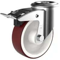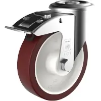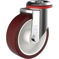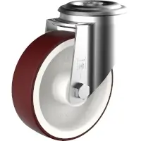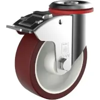 Stahlblechgehäuse mit Rückenlochbefestigung. Gabelkopf mit zweifachem Kugelkranz. Die Grundplatte wird fest mit dem Gabelteil vernietet, dabei achten wir auf geringes Spiel im Gabelkopf bei hoher Leichtgängigkeit. Die Serie R ist für handverschobene Tragfähigkeiten bis 300 kg geeignet. DS Räder haben eine perlrubinrote Lauffläche aus thermoplastischem Polyurethane (TPU) in einer Härte von 96 Shore A, die auf eine Polyamid-Felge (PA 6) gespritzt ist. Die Räder sind mit Rollen- oder Rillenkugellager ausgestattet.