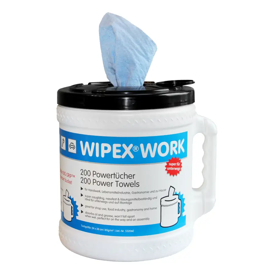 WIPEX® WORK Powertücher kombinieren starke Saugfähigkeit mit Langlebigkeit und sind in einem praktischen, nachfüllbaren BIG GRIP Spender erhältlich. Dieser schützt die perforierte Wischtuchrolle aus Zellstoffvlies effektiv vor Staub, Schmutz und Nässe, wodurch die Tücher stets griffbereit und in optimaler Zustand bleiben.