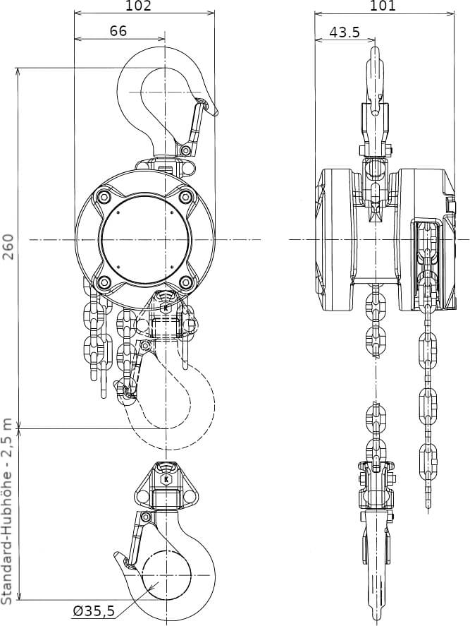 Mit 2,4 kg Eigengewicht, einer minimalen Bauhöhe von 217 mm und 250 kg Traglast gehört der KITO CX003 Mini Kettenzug unübertroffen zu den kleinsten und leichtesten unter den Handkettenzügen. Die etwas größere Variante CX005 mit 4,5 kg Eigengewicht und 260 mm Bauhöhe erzielt eine Traglast von 500 kg.