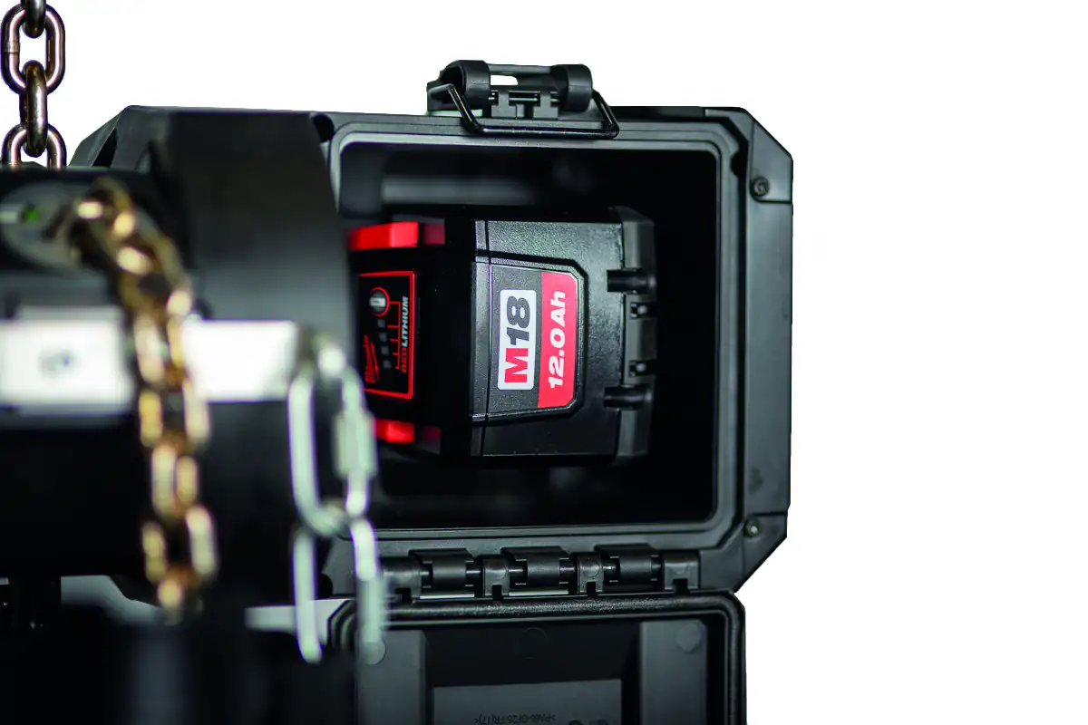 Das Gerät wird über einen M18 Red Lithium Akku von Milwaukee Tool gespeist und ist für einen Hubbereich von 6.0 m bei stufenlos regelbarer Hubgeschwindigkeit bis etwa 2.4 m/min ausgelegt.