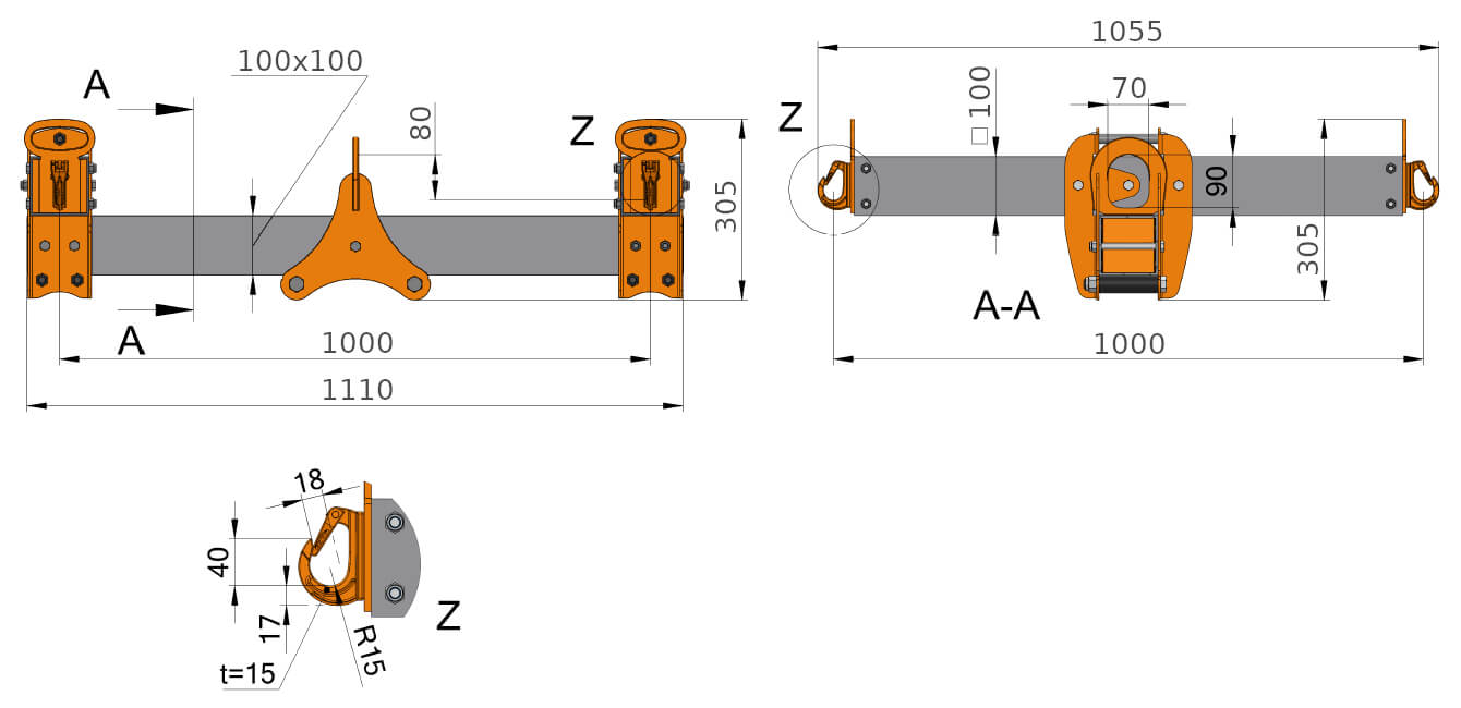 Die vier Anschweißhaken an den Enden der Querbalken ermöglichen ein schnelles Anschlagen der Last. Sicherheitsverschlüsse an den Haken verhindern ein ungewolltes heraus springen der Anschlagmittel. Tragegriffe über den Lasthaken ermöglichen einen Transport mit vier Personen. Somit ist die Bereitstellung der Traverse auch dann gewährleistet, wenn kein Stapler oder Hebezeug zur Verfügung steht. Beschlagteile wie Kranaufhängeöse, Kreuzverbinder und Lasthaken sind aus Stahl und orange lackiert.