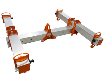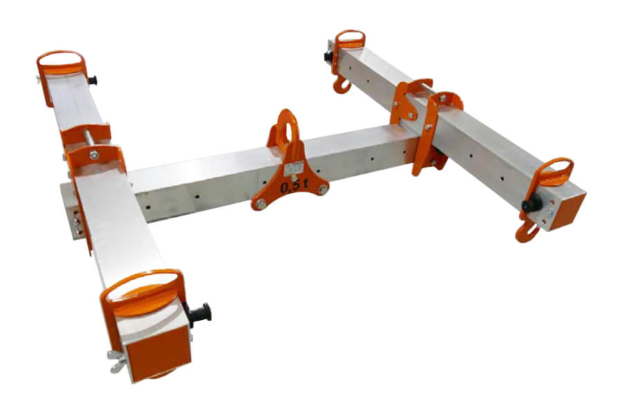 Die Alu H-Traverse AHTV besteht aus einem Hauptträger mit Kranöse und seitlich aufliegenden Quertraversen. Kreuzverbinder zentrieren die Querträger und ermöglichen ein einfaches Verschieben. Die vier Lasthaken sind als Brennhaken über die Längsrichtung der Querträger verstellbar. Für eine bessere Haptik sind sie mit Führungsgriffen ausgestattet. An den Enden der Träger verhindern Endanschläge ein Abrutschen der Haken oder Quertraversen.